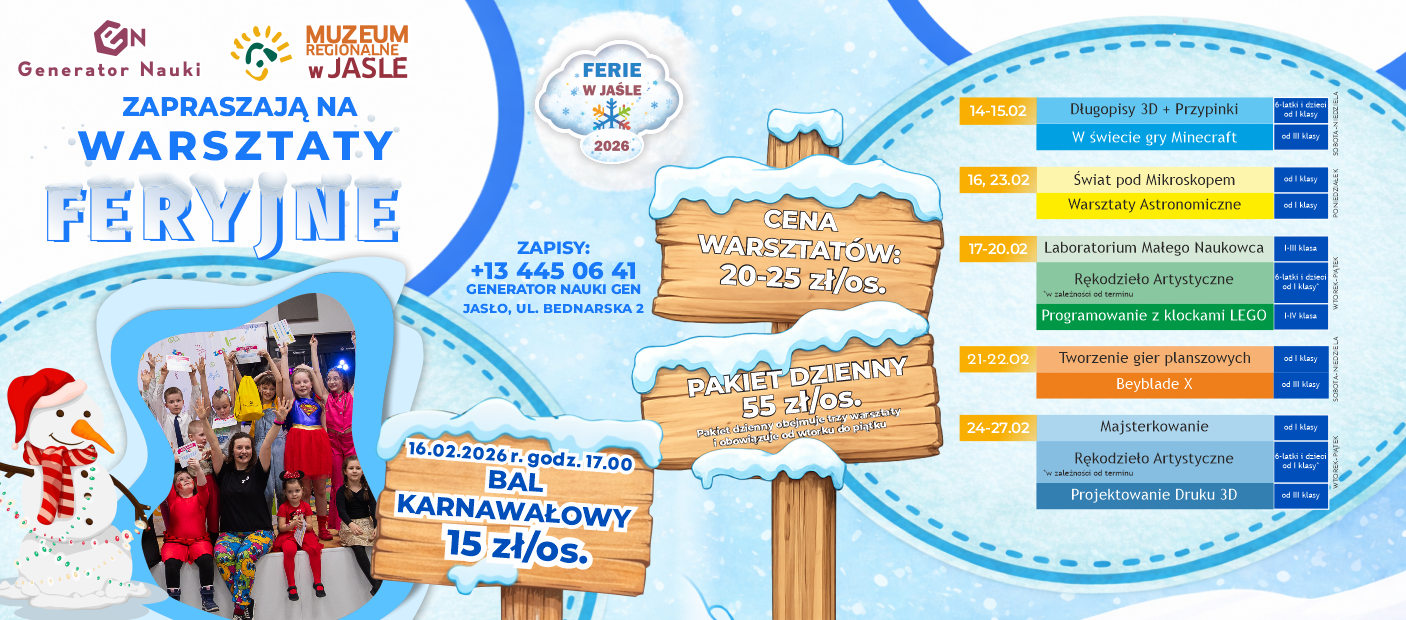 Zimowa przerwa coraz bliżej, a my mamy dla Was świetną wiadomość: w ferie wcale nie trzeba się nudzić! Muzeum Regionalne w Jaśle i Generator Nauki GEN przygotowali dla dzieci i młodzieży masę atrakcji, dzięki którym te ferie zapowiadają się naprawdę wyjątkowo. Będą nowe warsztaty, sporo niespodzianek i dużo dobrej zabawy. Warto zapisać się wcześniej, bo liczba miejsc jest ograniczona i szybko się zapełnia!