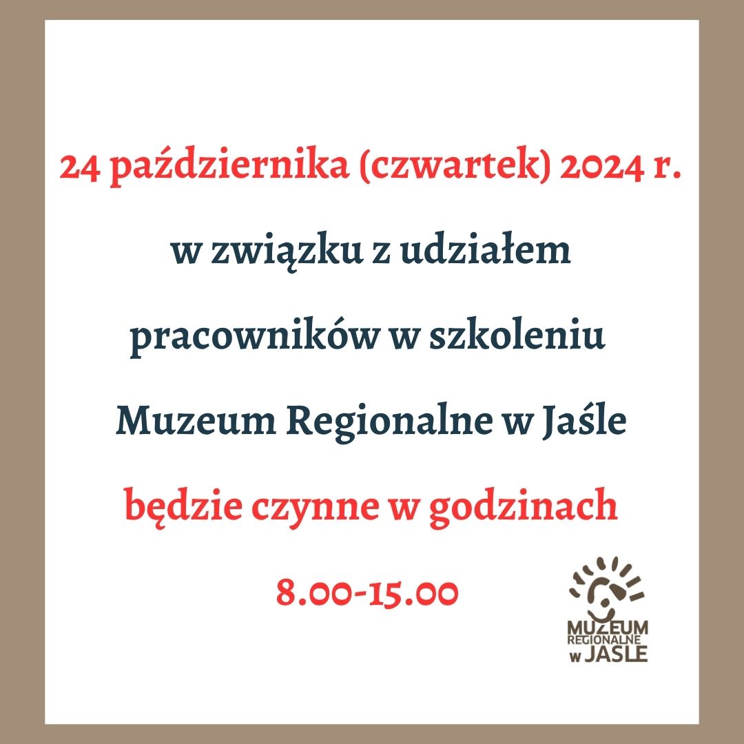 Informujemy, że w związku z udziałem pracowników w szkoleniu w dniu 24 października (czwartek) 2024 r., nasze Muzeum będzie czynne w godzinach 8.00-15.00.