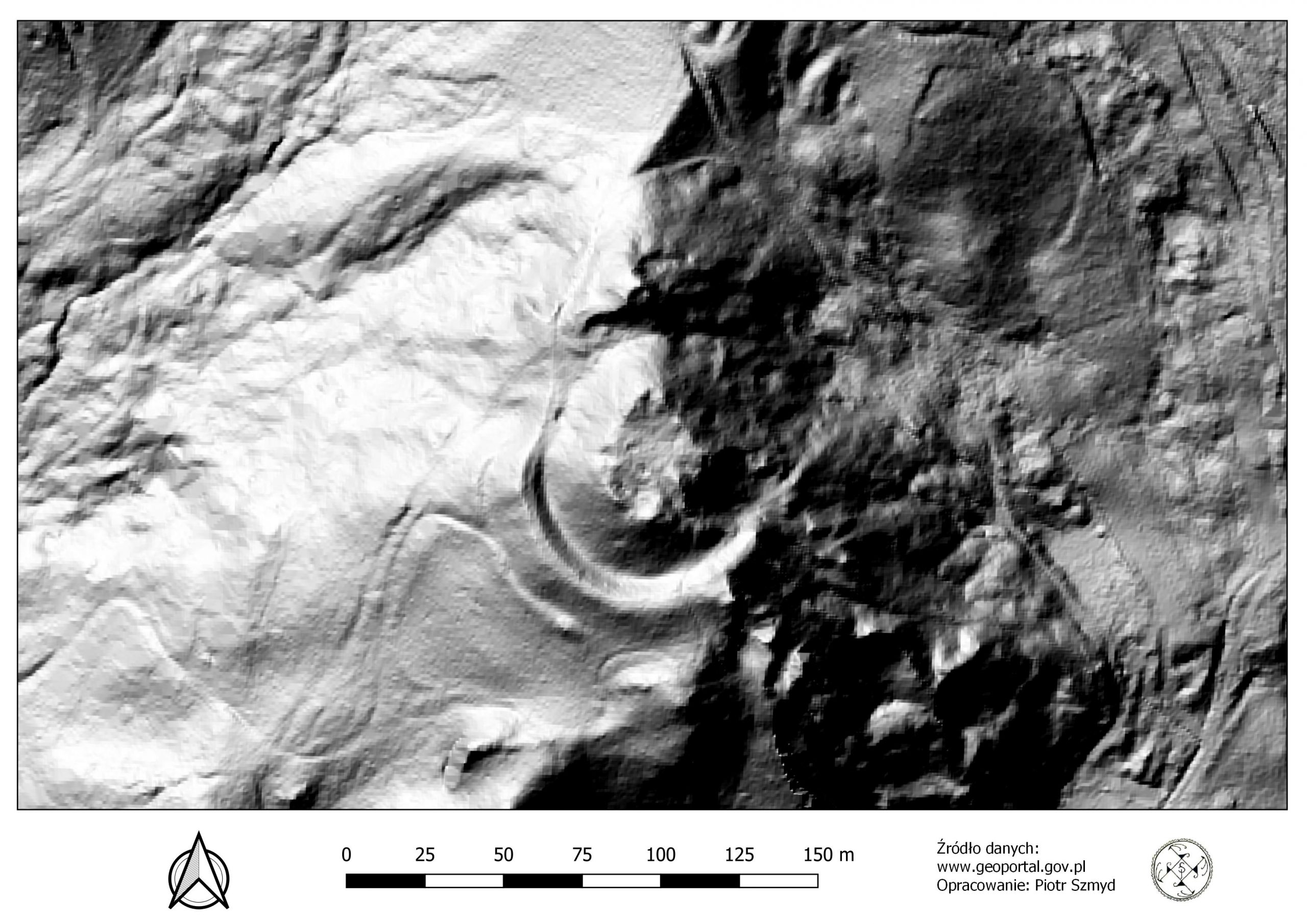 przebieg murów kurtynowych o szerokości od 1,5 – 1,8 m, opasujących wzgórze zamkowe.