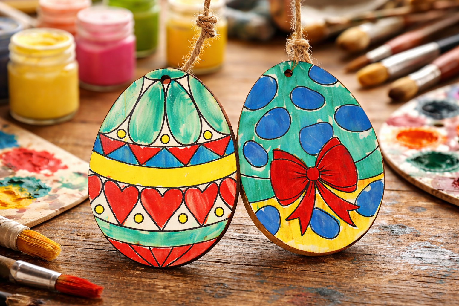 • Kolorowe, ręcznie zdobione drewniane zawieszki w kształcie jajek
