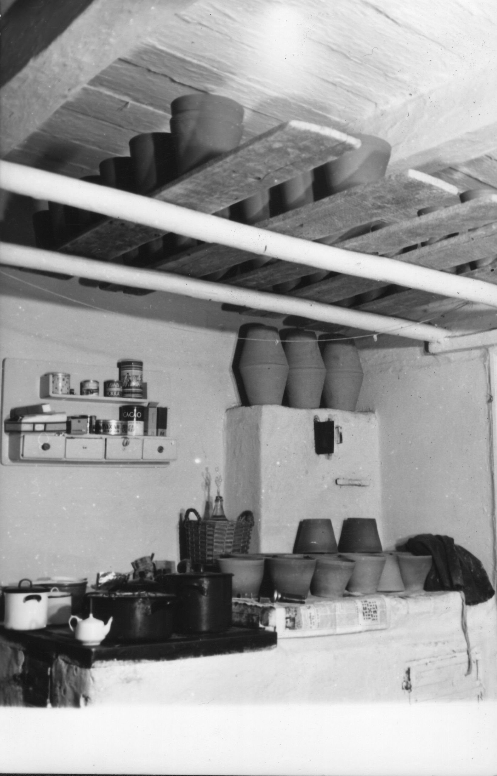 Ich warsztat stanowiła izdebka obok kuchni, znajdowały się tam dwie ławki, w tym jedna z krążkiem do toczenia naczyń. W pomieszczeniu znajdowały się także liczne podwieszenia i półki do suszenia naczyń.