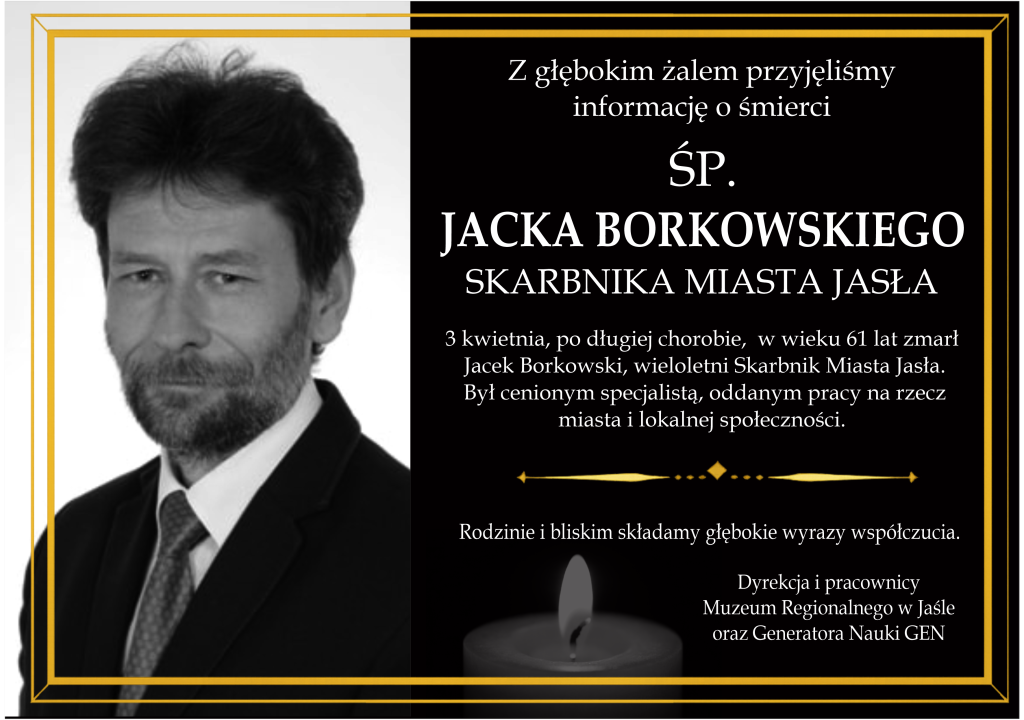 Z głębokim smutkiem przyjęliśmy wiadomość o śmierci śp. Jacka Borkowskiego, wieloletniego Skarbnika Miasta Jasła, który 3 kwietnia br., po długiej chorobie, przeżywszy 61 lat odszedł do wieczności ![]()