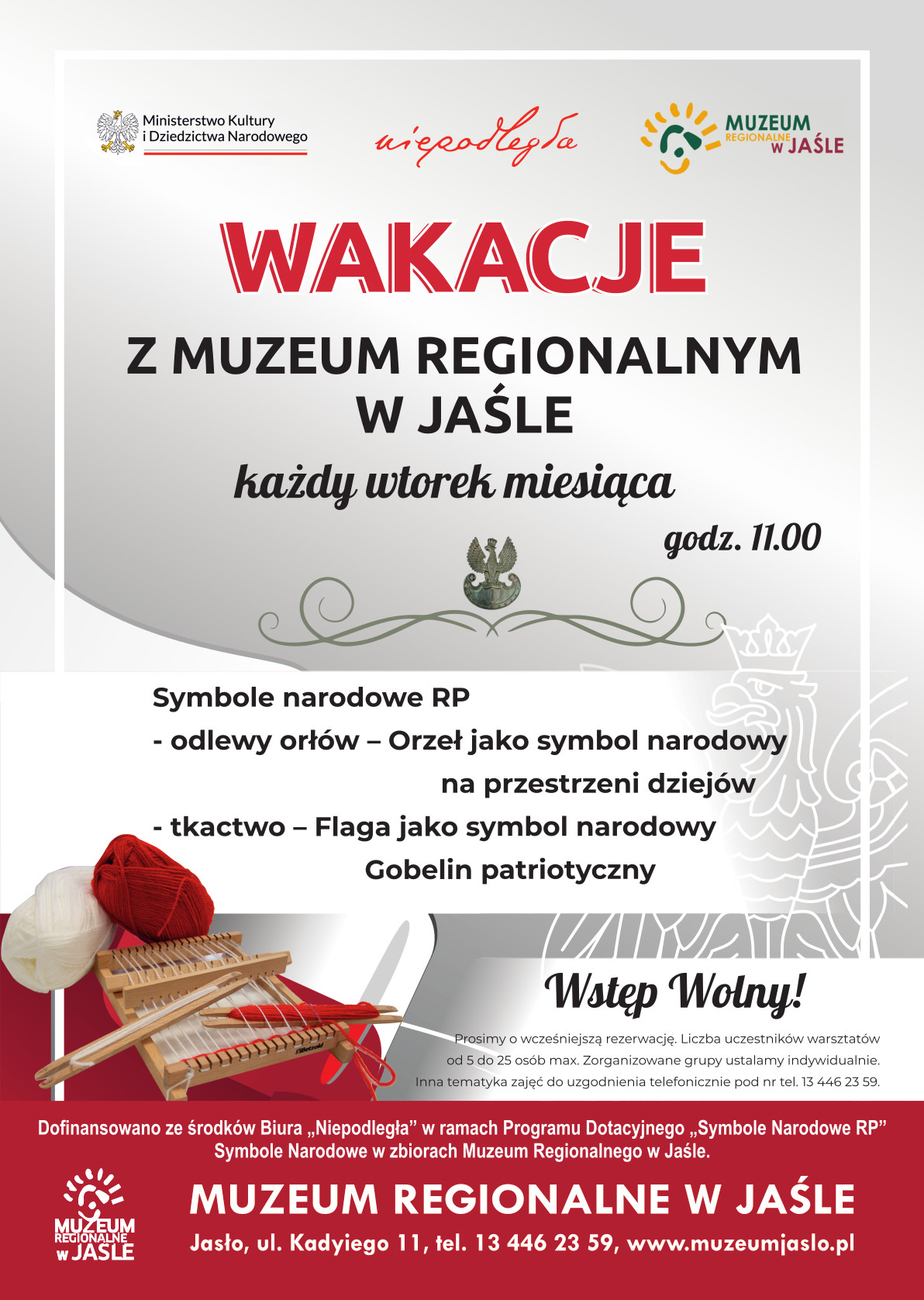 Głównym celem projektu jest wystawa prezentująca symbole narodowe RP w zbiorach Muzeum Regionalnego w Jaśle i w zbiorach Kolekcjonerów zrzeszonych w Polskim Towarzystwie Numizmatycznym Oddział  w Jaśle. Do wystawy powstanie Katalog. W ramach projektu przewidziano również warsztaty, których celem jest popularyzacja wiedzy o Symbolach Narodowych wśród mieszkańców Jasła i odwiedzających Muzeum Regionalne gości. W swym założeniu warsztaty mają nawiązywać do tradycji lokalnej. Między innymi uczestnicy warsztatów będą mogli wykonać sobie mini gobeliny w barwach biało czerwonych. W ramach projektu zakupiono dla uczestników krosna i wełnę. Symbolem Państwa Polskiego jest od średniowiecza Orzeł Biały. Muzeum posiada unikatową kolekcję orłów wojskowych i formacji mundurowych od połowy XIX do drugiej połowy XX w. Na potrzeby warsztatów zostały wykonane matryce, które są odwzorowaniem wybranych wizerunków orłów z kolekcji muzeum. Część matryc posłuży do wykonania podczas warsztatów odlewów gipsowych. Po pokolorowaniu i doklejeniu magnesu będą pamiątką dla uczestników. Dla bardziej wymagających uczestników przewidziano wykonanie odcisków orłów w glinie ceramicznej. Warsztaty w swej formie będą nawiązaniem do tradycyjnych form rzemiosła  ( tkactwo i garncarstwo ), jakie rozwijały się w Jaśle od średniowiecza do początków XX w.