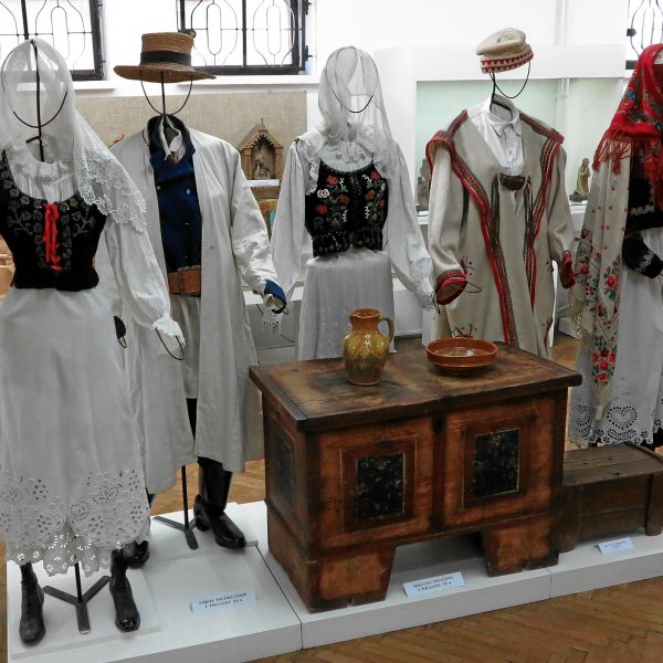 Drugą cenną grupą eksponatów etnograficznych są tradycyjne ludowe stroje  pogórzańskie i łemkowskie. Wśród nich na uwagę zasługują kobiece gorsety zdobione cekinami i barwnym haftem a także bluzki, spódnice, zapaski i chusty czepcowe zdobione białymi, ażurowymi haftami o motywach roślinnych. Do najciekawszych elementów pogórzańskich strojów męskich należą tradycyjne „płótnianki” datowane na przełom XIX i XX w.